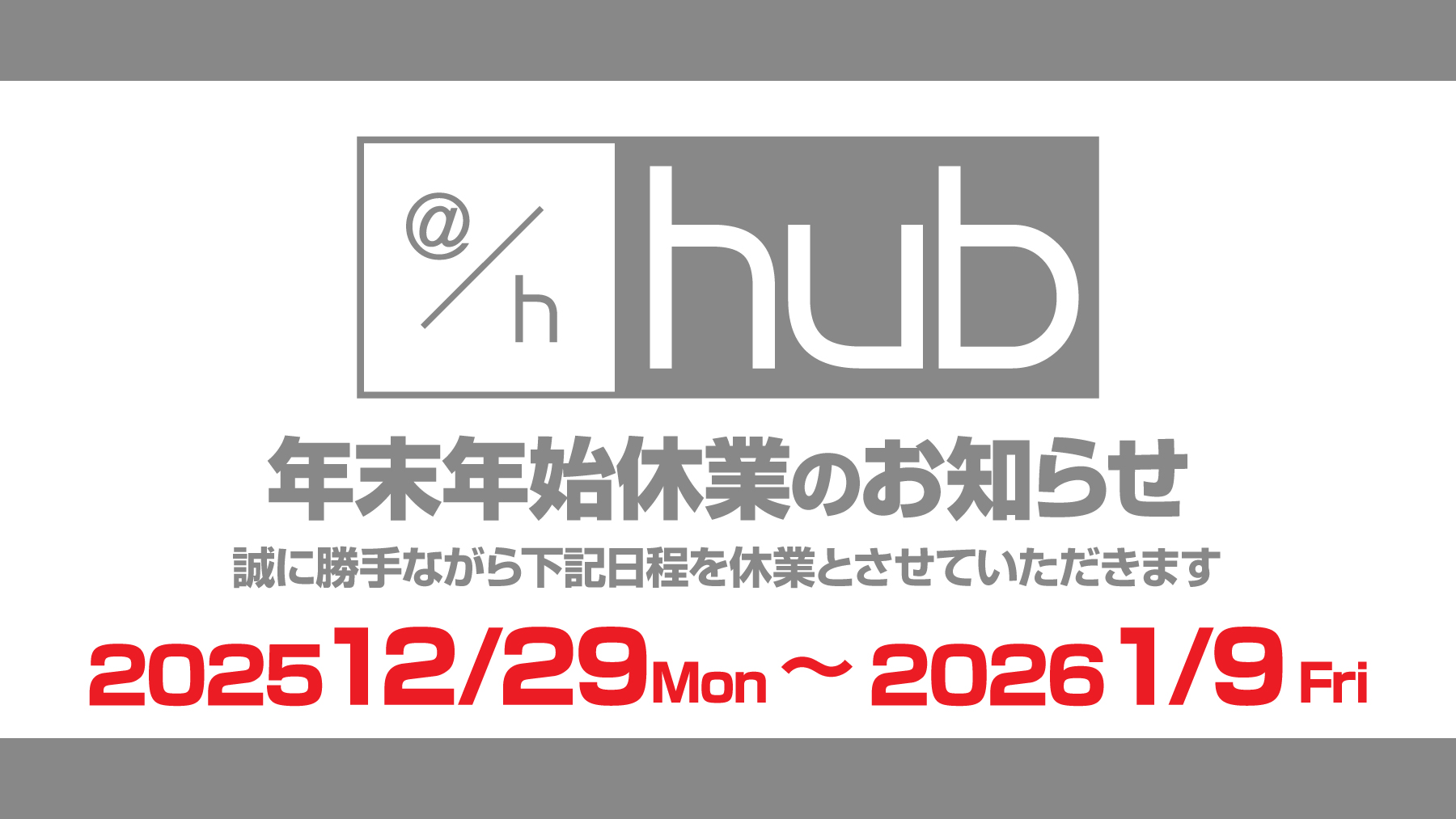 平素は格別のご高配を賜り、厚く御礼申し上げます。誠に勝手ながら、ライフスタイル発信スポット@hubでは下記の期間を年末年始休業とさせていただきます。ご不便をお掛けいたしますが、何卒宜しくお願い申し上げます。 休業期間: 2025年12月29日(月)~2026年1月9日(金)2026年1月10日(土)より営業開始となります。 本年のご愛顧に感謝を申し上げますと共に、来年も変わらぬお引き立てのほど、よろしくお願い申し上げます。